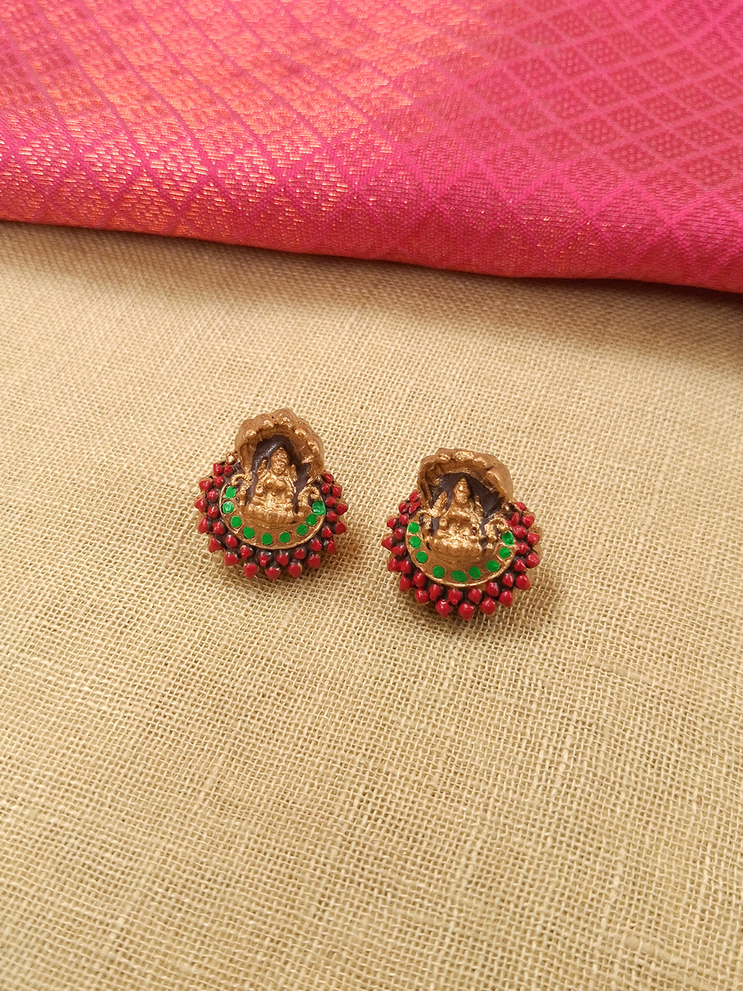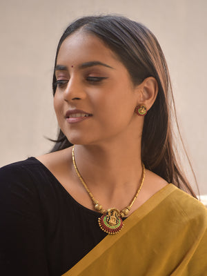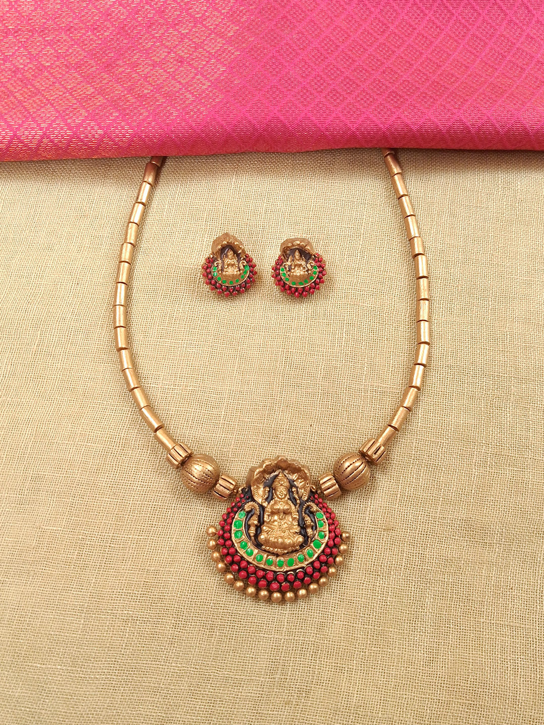 Shubhalakshmi – Handmade Terracotta Lakshmi Necklace Set with Red–Green Detailing and Antique Gold Beads