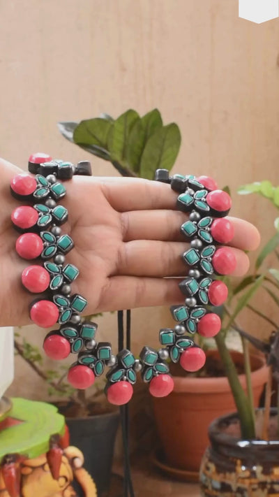 Taralika — Silver Pink Aqua Blue Cherry Design Handmade Terracotta Necklace Set
