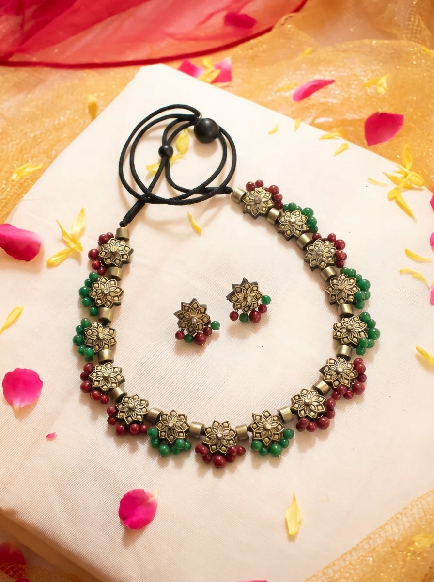 Sreeanjali — Antique Gold Floral Tube Design Maroon/Green Kundan Stone Handmade Terracotta Necklace Set