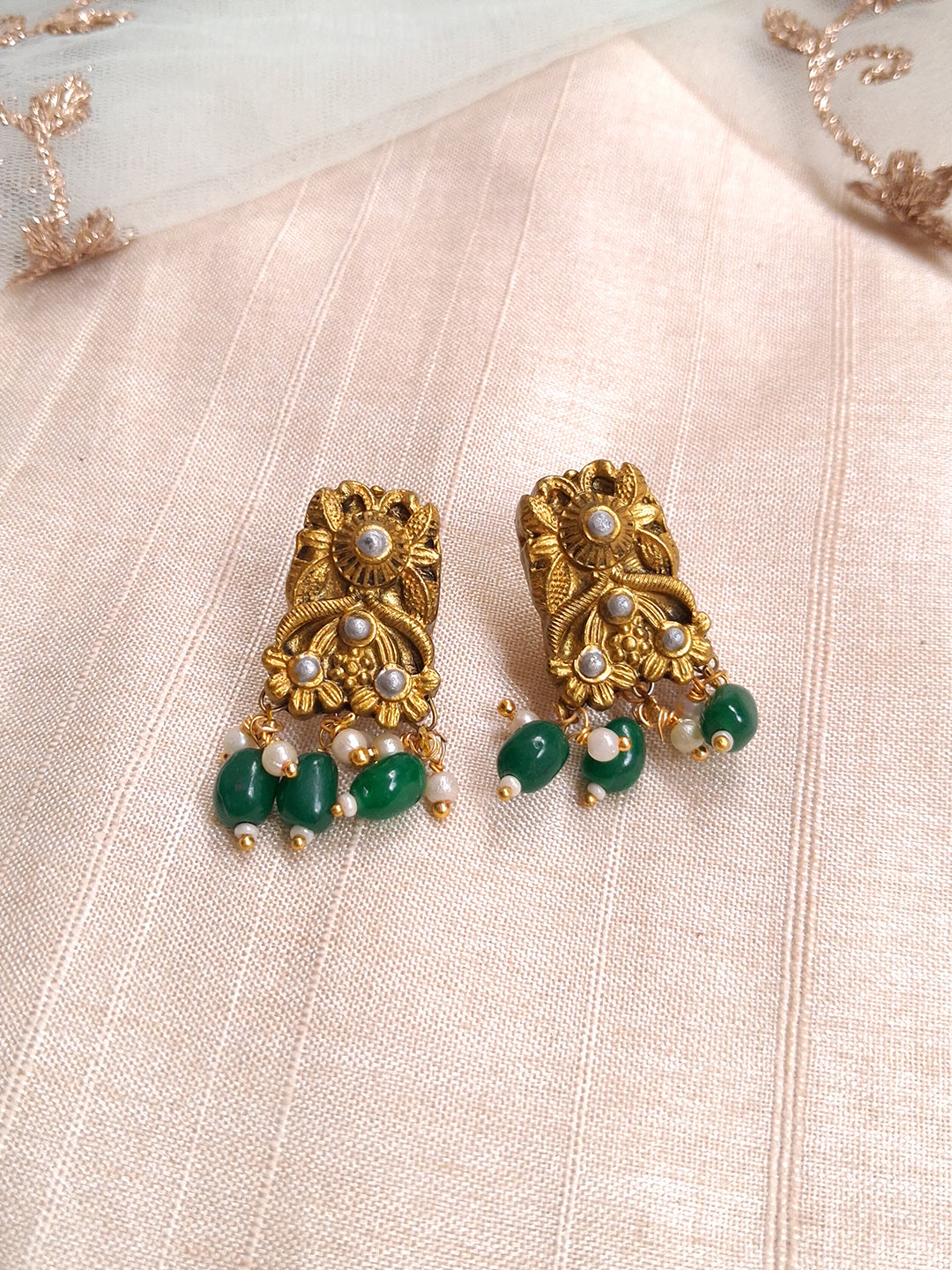 Terracotta Antique Gold Floral Temple Choker with Green Bead Drops & Pearl Accents