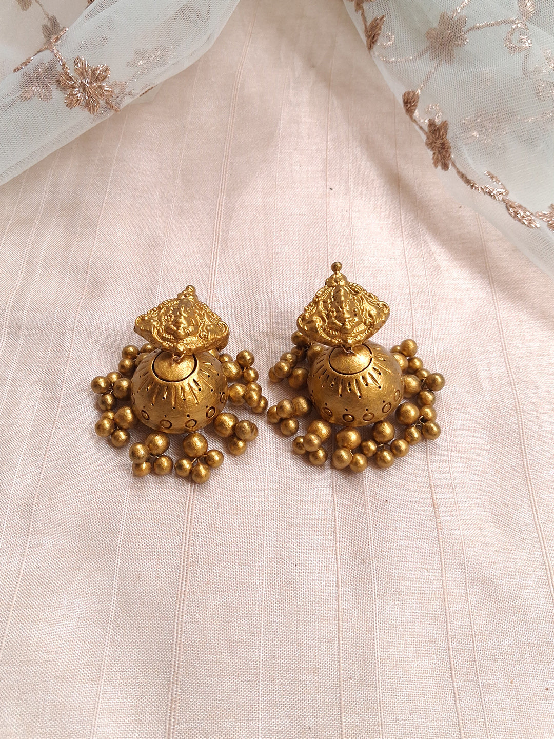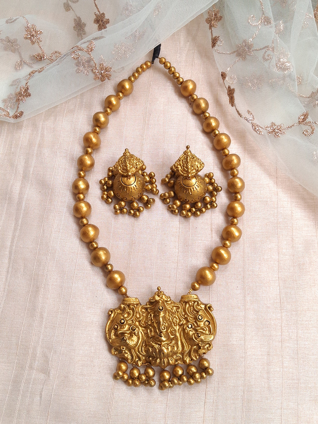 Terracotta Antique Gold Ganesha Temple Necklace with Round Bead Chain & Jhumka Earrings