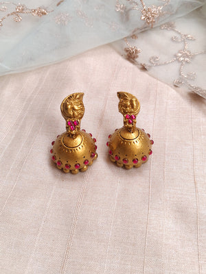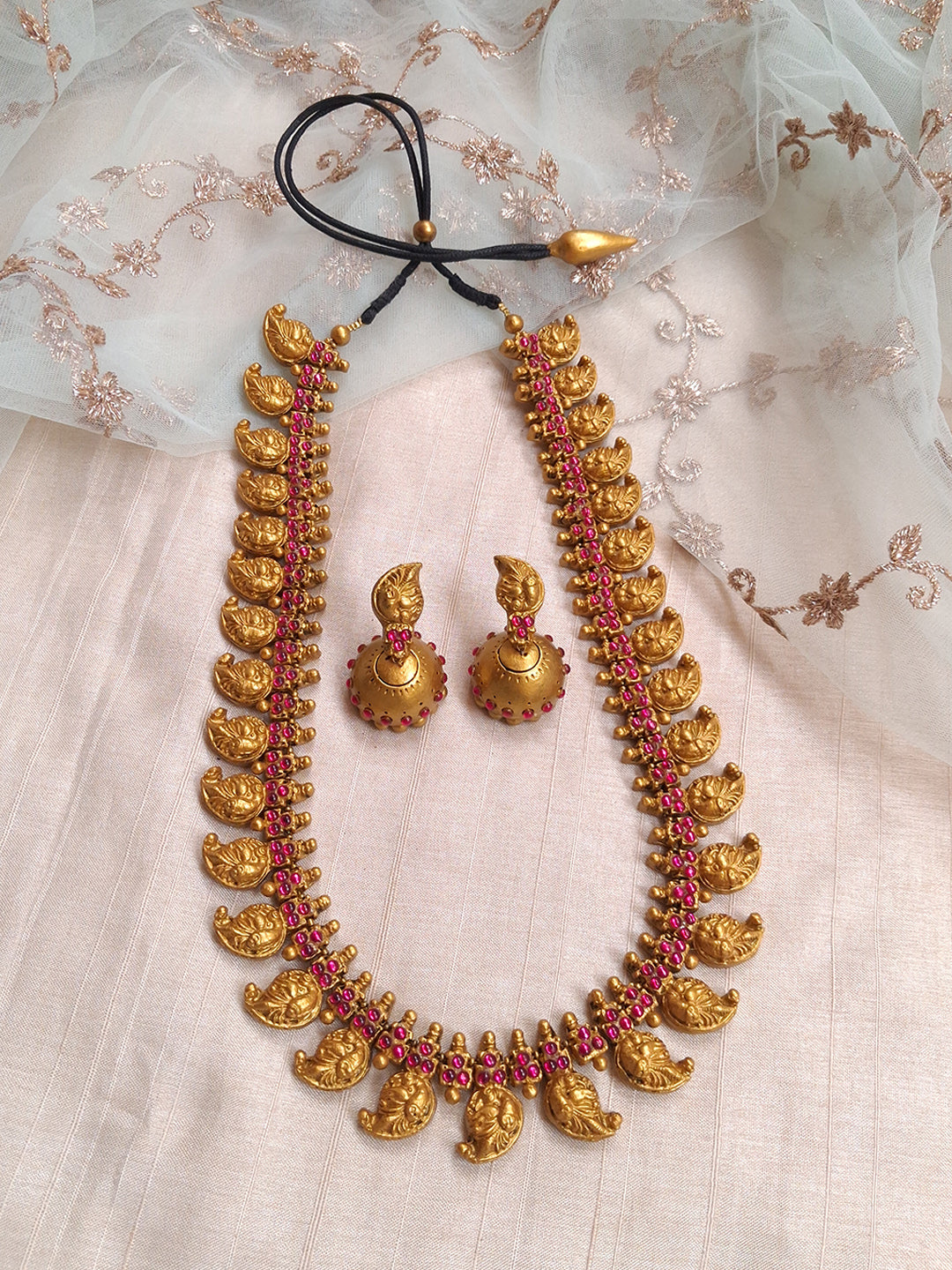 Terracotta Antique Gold Mango Motif Long Haram Necklace with Pink Stone Detailing & Jhumka Earrings