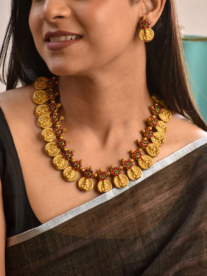 Terracotta Antique Gold Temple Coin Necklace with Multicolor Floral Accents & Drop Earrings