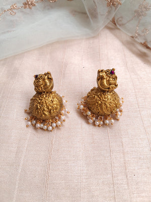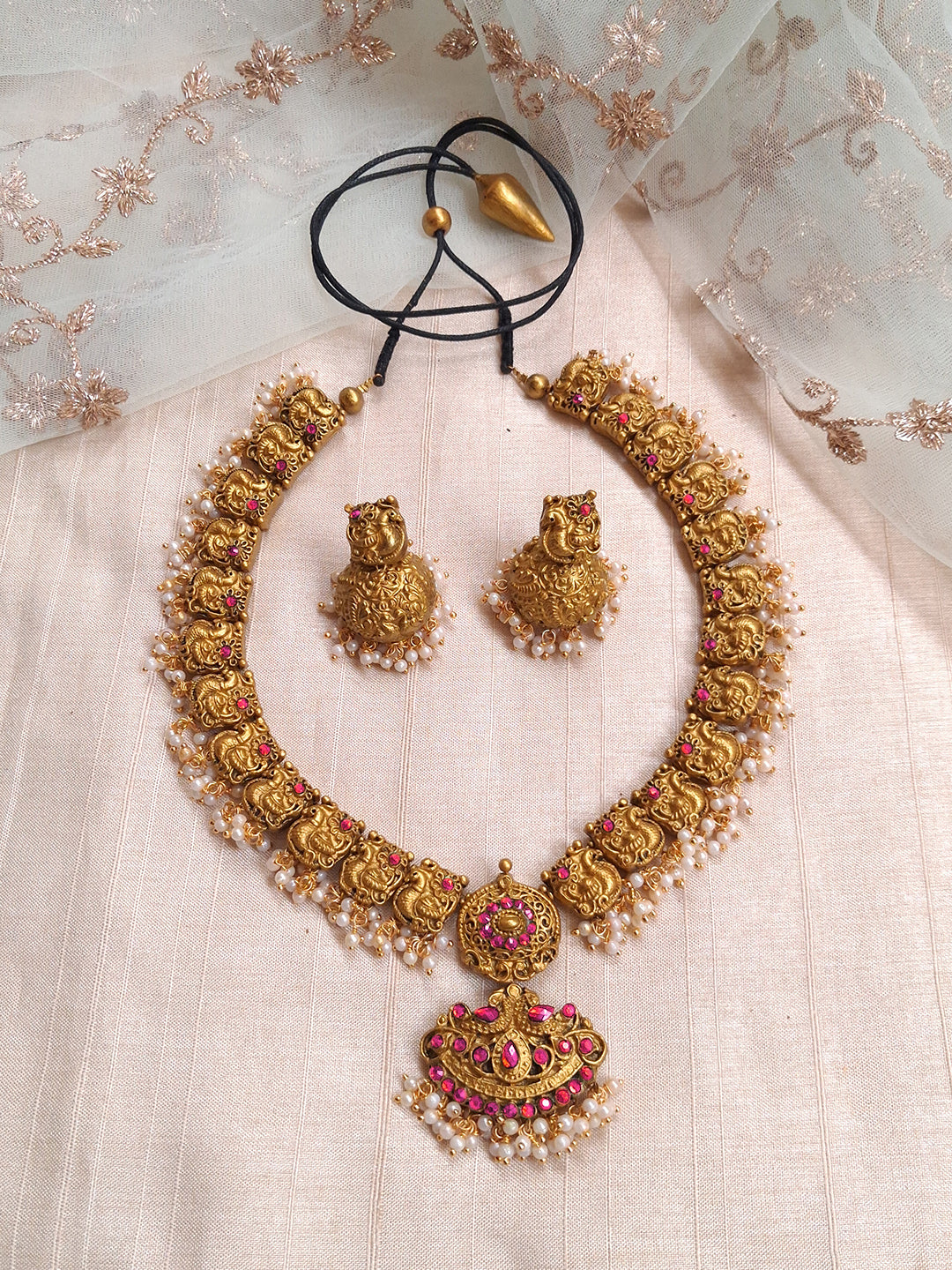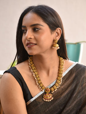 Terracotta Antique Gold Temple Coin Necklace with Pearl Drops & Jhumka Earrings