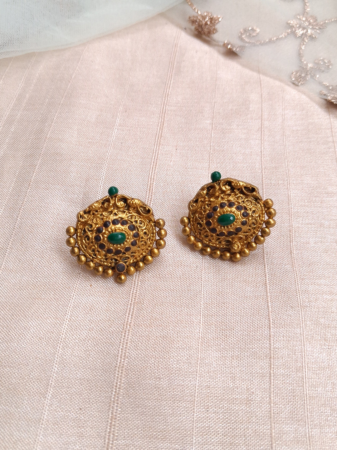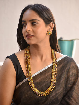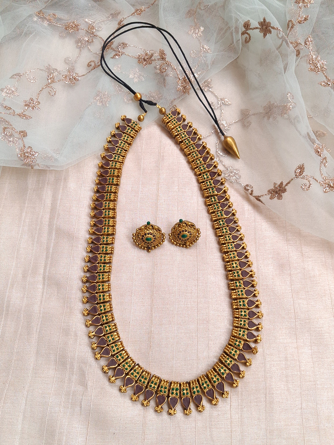 Terracotta Antique Gold Temple Long Necklace with Green Stone Detailing & Oval Stud Earrings