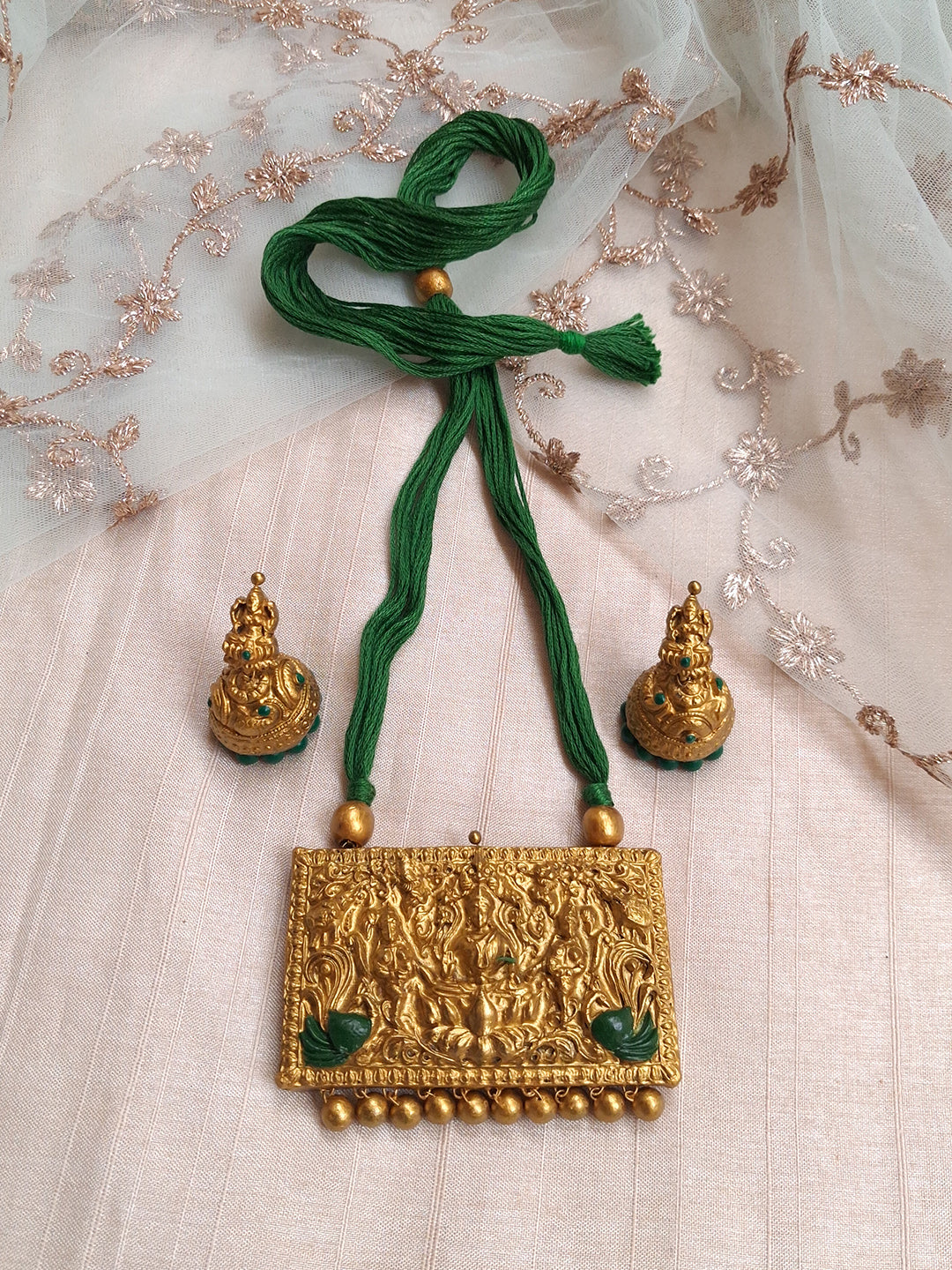 Terracotta Antique Gold Temple Pendant Necklace with Green Thread Cord