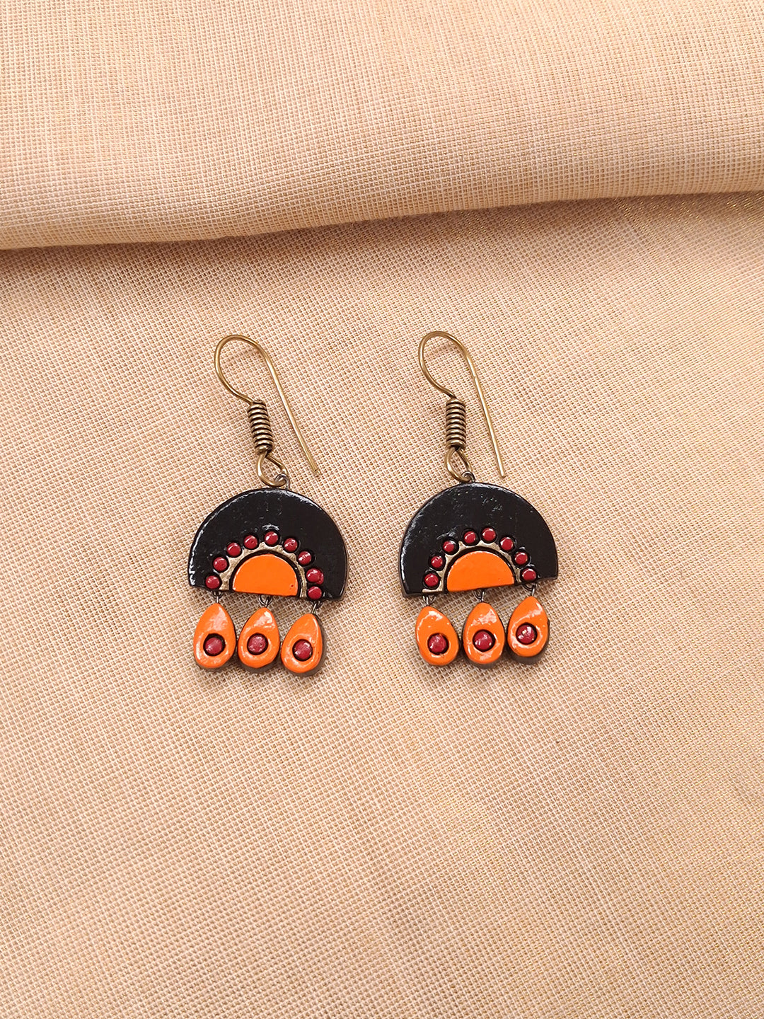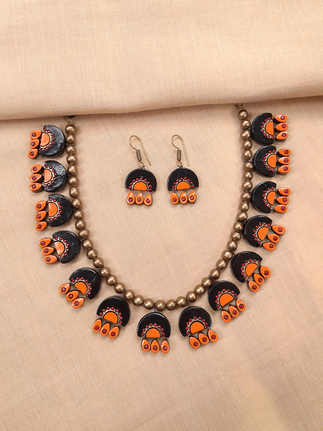 Terracotta Black & Orange tribal Motif Necklace Set With Hanging Studs