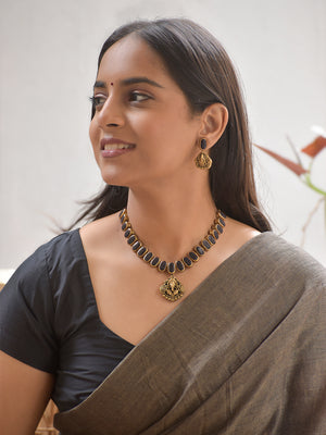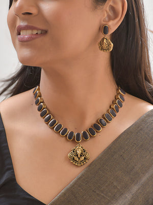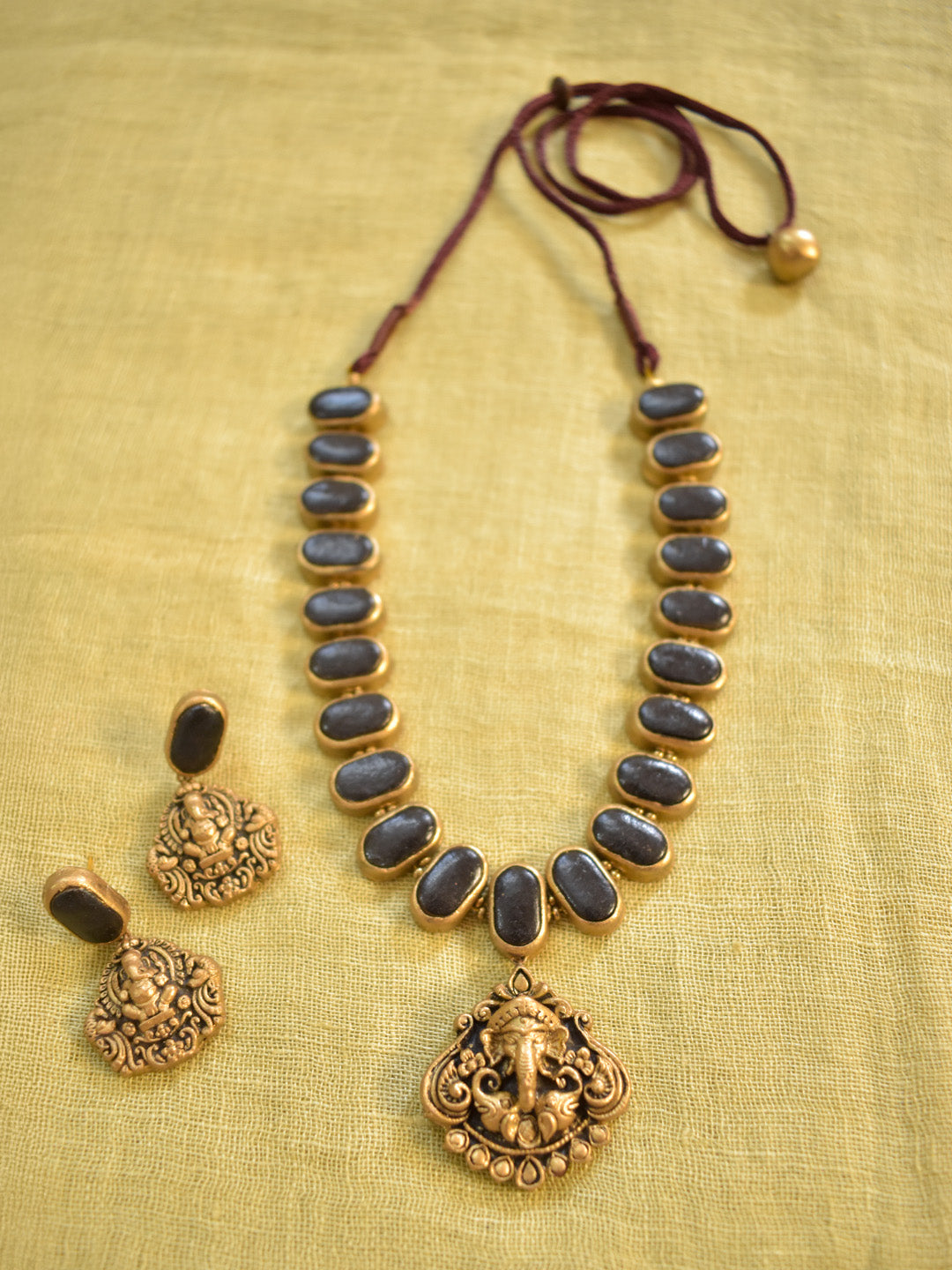 Terracotta Black Oval Bead Necklace with Ganesha Pendant & Earrings