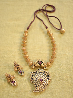 Terracotta Cone Bead Necklace with Peacock Motif & White Paisley Pendant