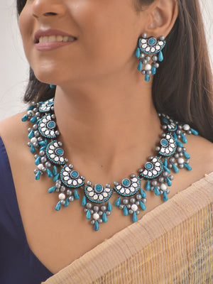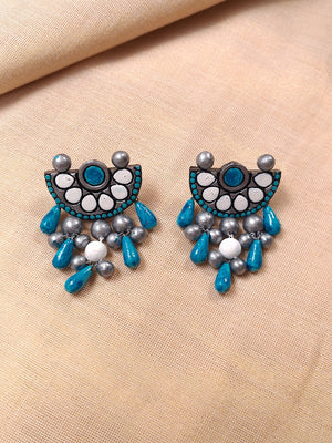 Chandramukta — Terracotta Crescent Shaped Necklace with Blue and White Teardrop Beads With Earrings