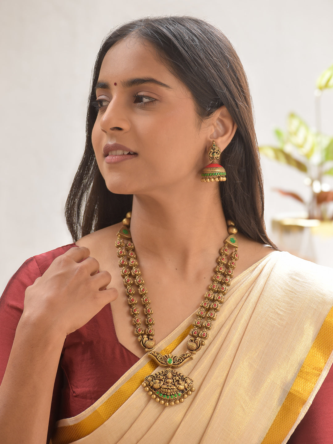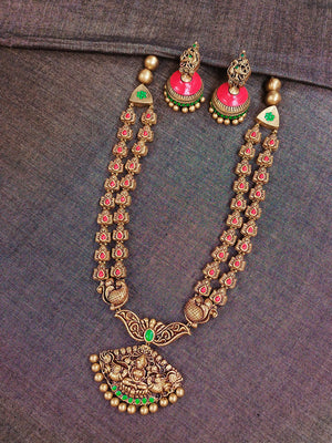 Home Terracotta Double-Layer Antique Necklace Set with Lakshmi Goddess Pendant