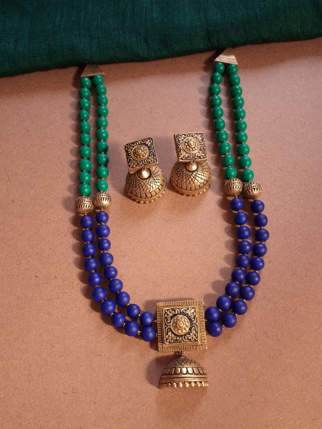 Terracotta Dual-Strand Green & Blue Bead Necklace with Antique Jhumka Pendant
