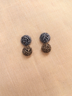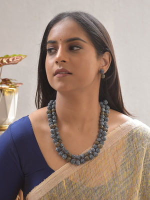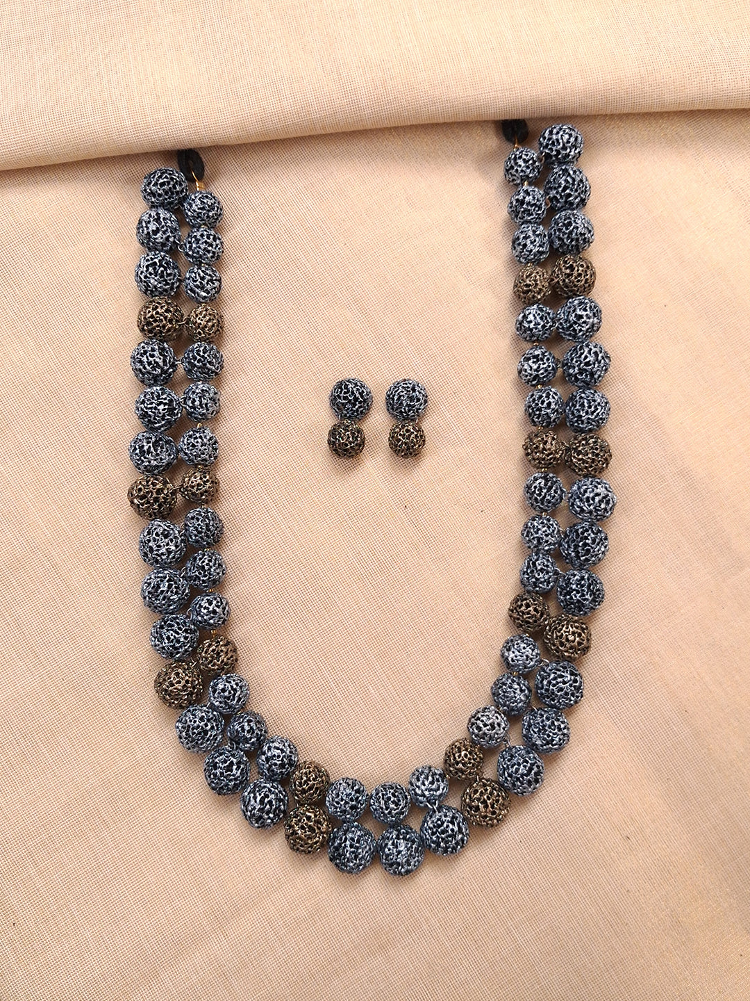 Terracotta Dual-Tone Silver and Brown Lava Textured Bead Necklace Set With Earrings