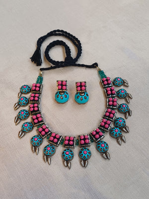 Terracotta Dual-Tone Statement Necklace with Pink and Turquoise Beads & Earrings