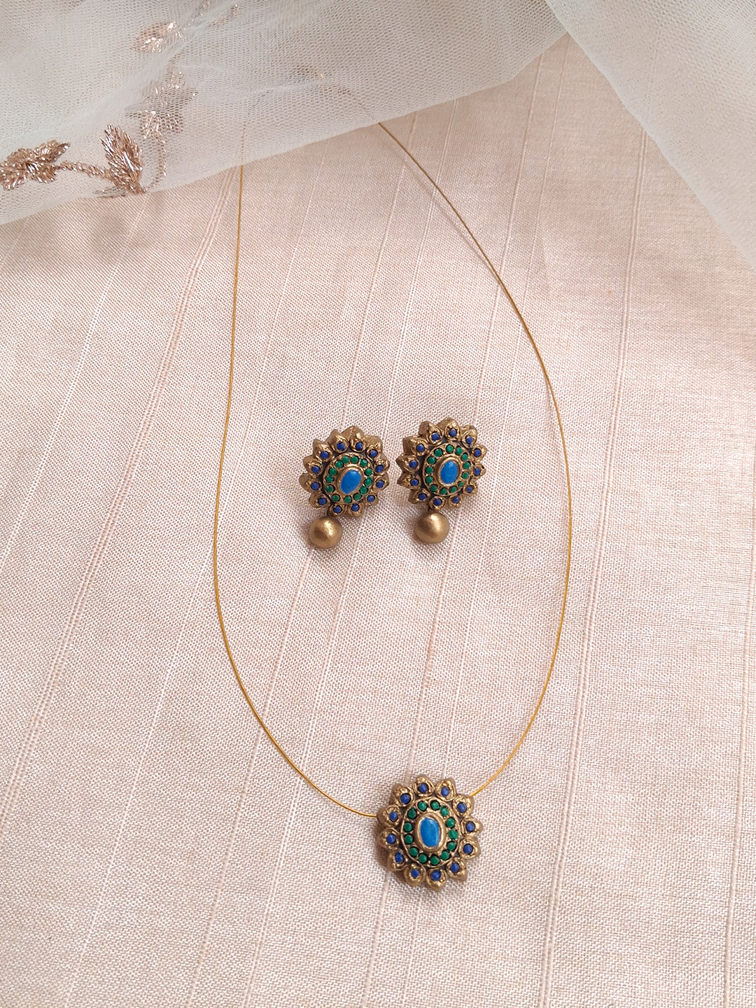 Terracotta Floral Sunburst Pendant Necklace with Matching Drop Earrings