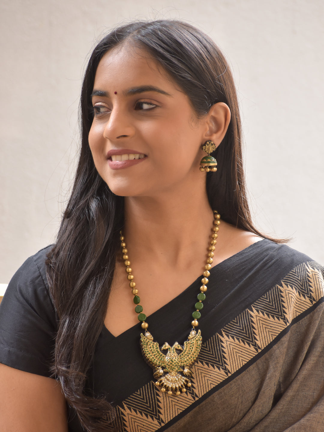 Terracotta Gold Green Beaded Peacock Motif Statement Necklace With Jhumkas