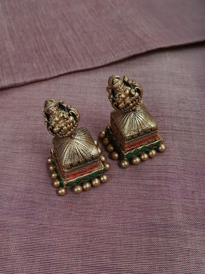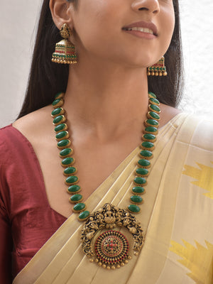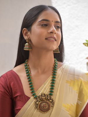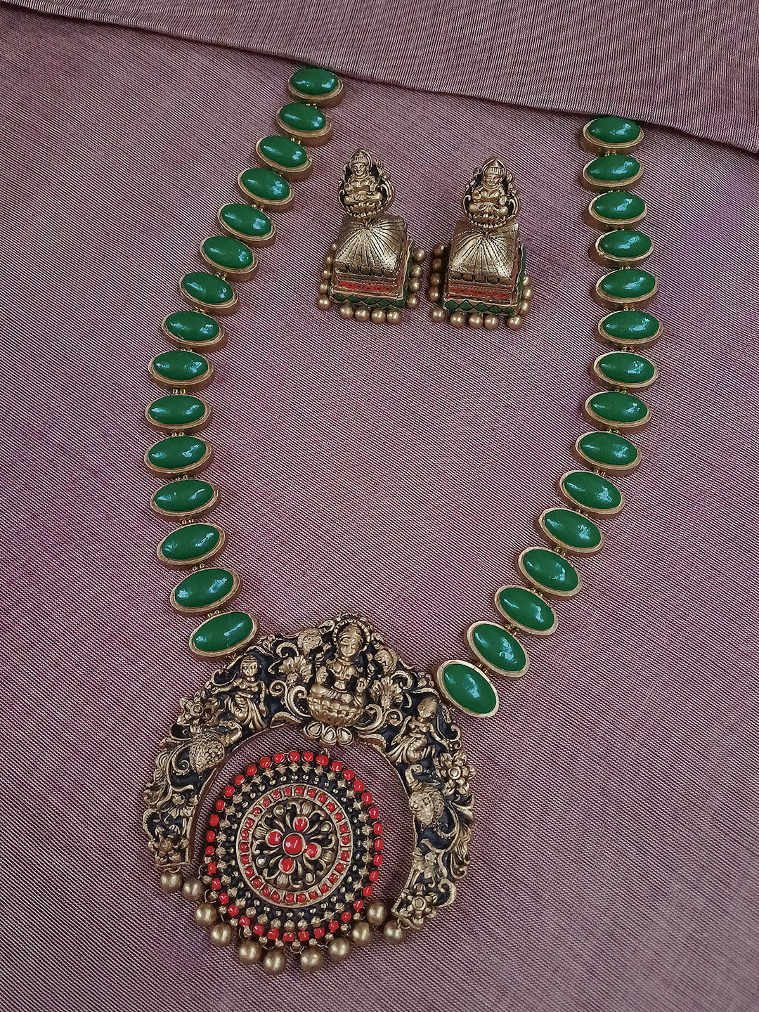 Terracotta Green Beaded Necklace Set with Temple Lakshmi Motif Pendant
