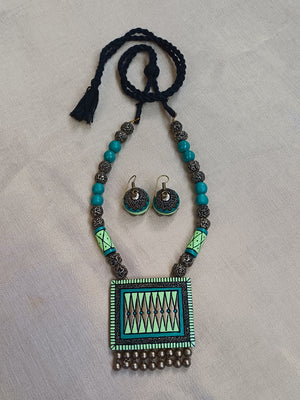 Terracotta Green Rectangular Pendant Beaded Necklace with Earrings