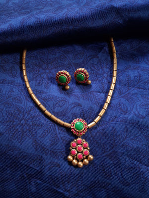 Terracotta Green Stone Pendant Necklace with Cylinder Beads