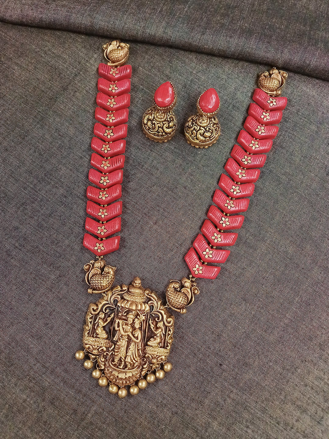 Terracotta Krishna Radha Pendant Necklace with Peacock Motifs and Earrings