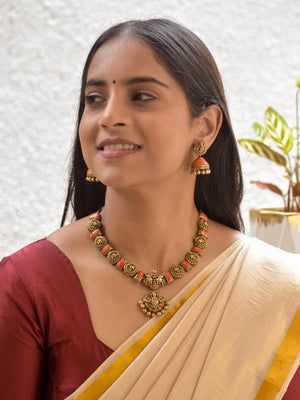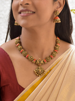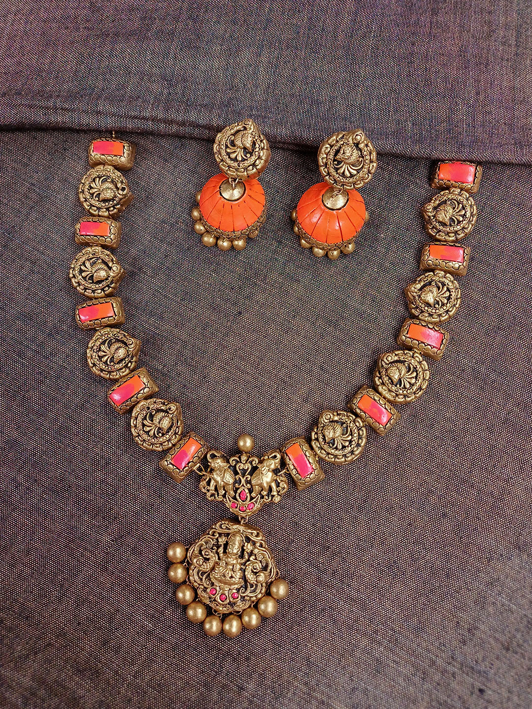 Terracotta Lakshmi Pendant Antique Temple Necklace Set with Pink Orange Highlights