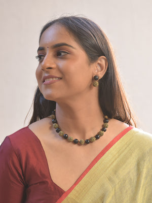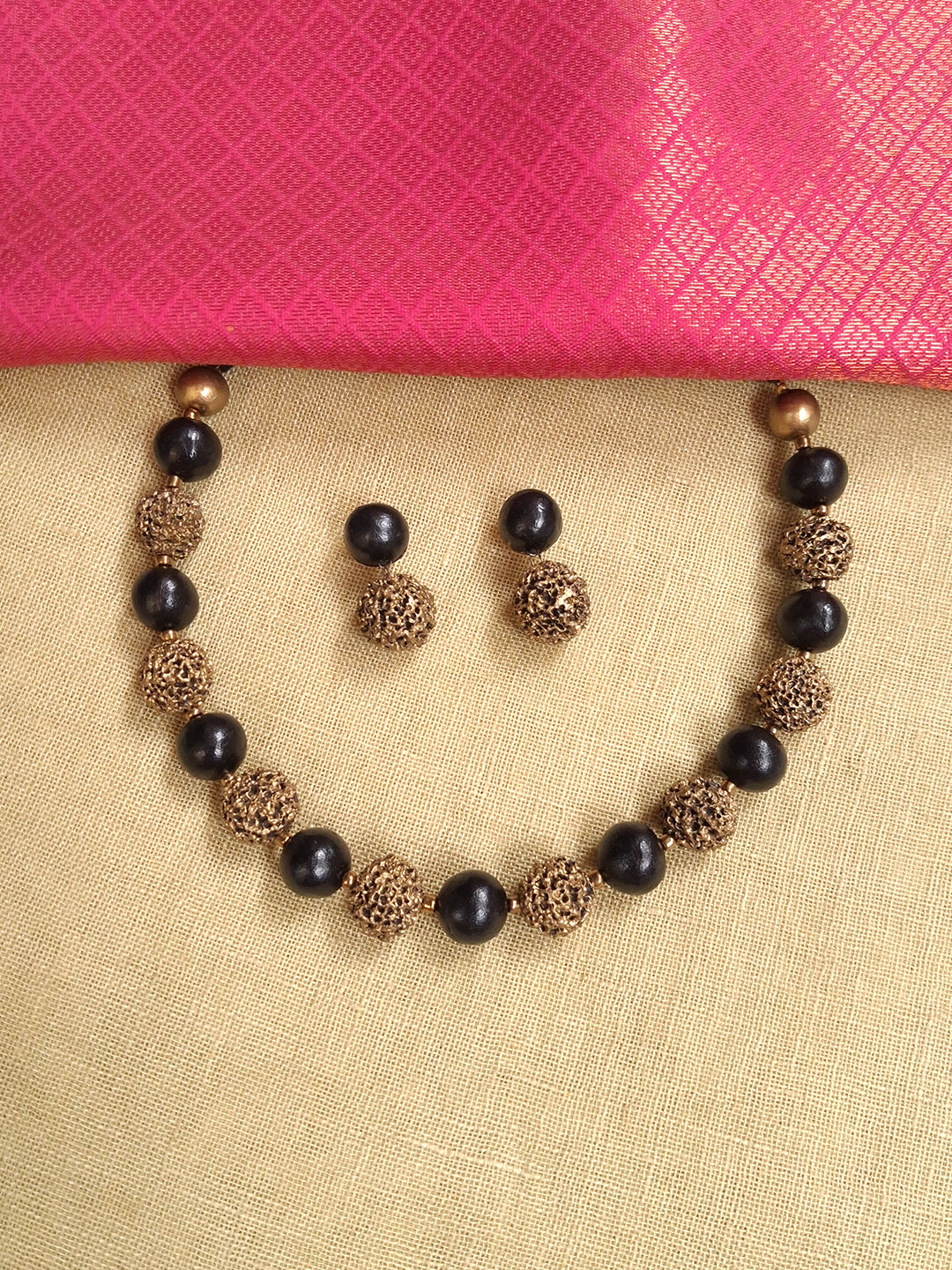Terracotta Lava Beads Black & Antique Gold Necklace Set With Jhumkas