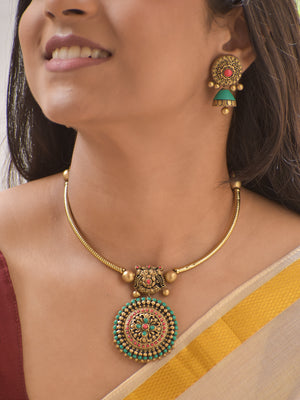 Terracotta Mandala Art Antique Round Pendant Necklace Set with Green Highlights
