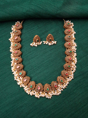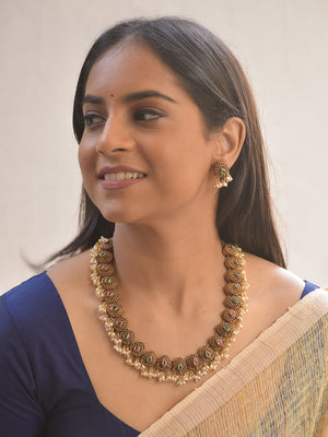 Terracotta Paisley Pearl-Edged Necklace with Red & Green Stone Design Accents With Studs