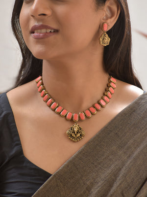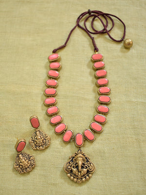 Terracotta Peach Oval Bead Necklace with Ganesha Pendant & Earrings