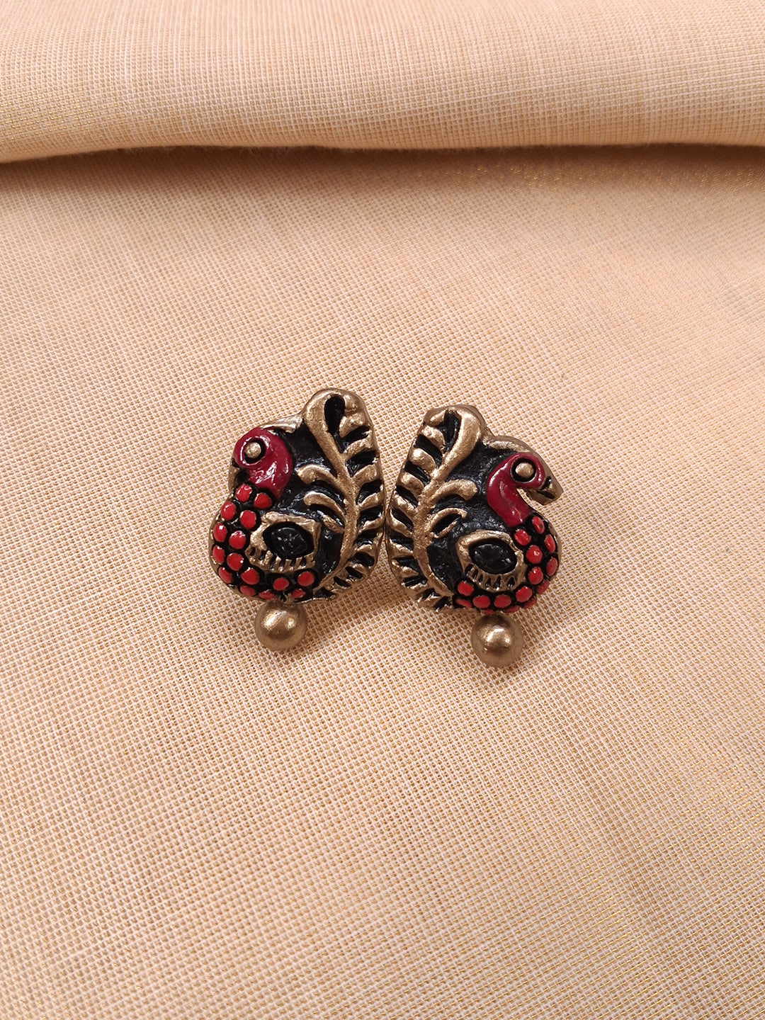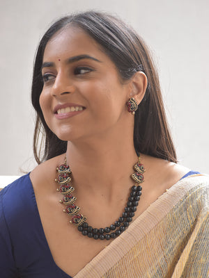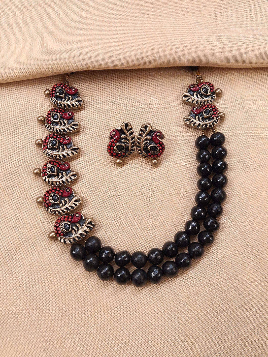 Terracotta Peacock Motif with Antique Gold, Red and Black Bead Necklace Set With Studs