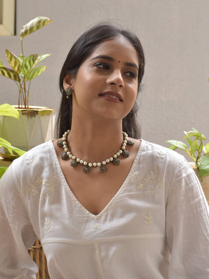 Terracotta Pearl Drop Necklace Set with Antique Gold Floral Embellishments Stud Earrings