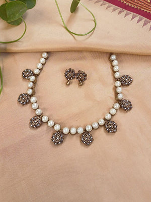 Home Terracotta Pearl Drop Necklace Set with Antique Gold Floral Embellishments Stud Earrings