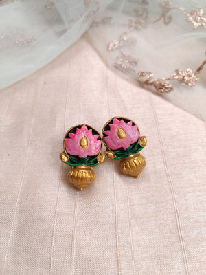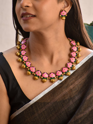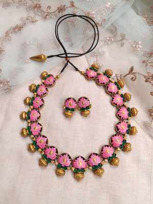 Terracotta Pink Lotus Floral Necklace with Green Leaf Detailing & Jhumka Drops