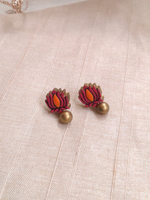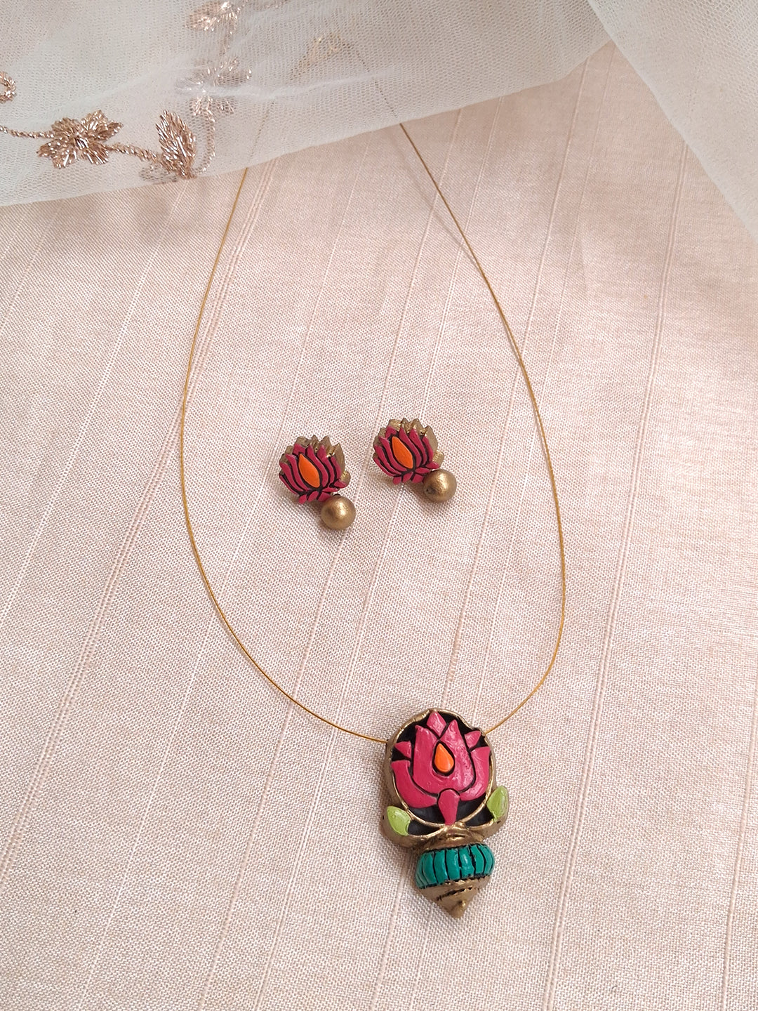 Terracotta Pink Lotus Pendant Necklace with Green Bead Drop & Matching Stud Earrings