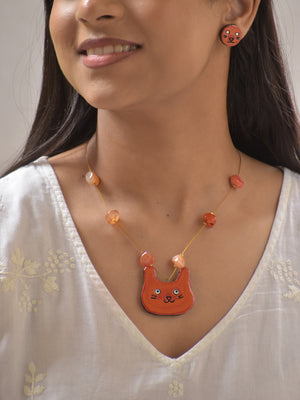 Terracotta Playful Orange Cat Face Necklace Set with Quirky Earrings