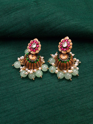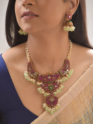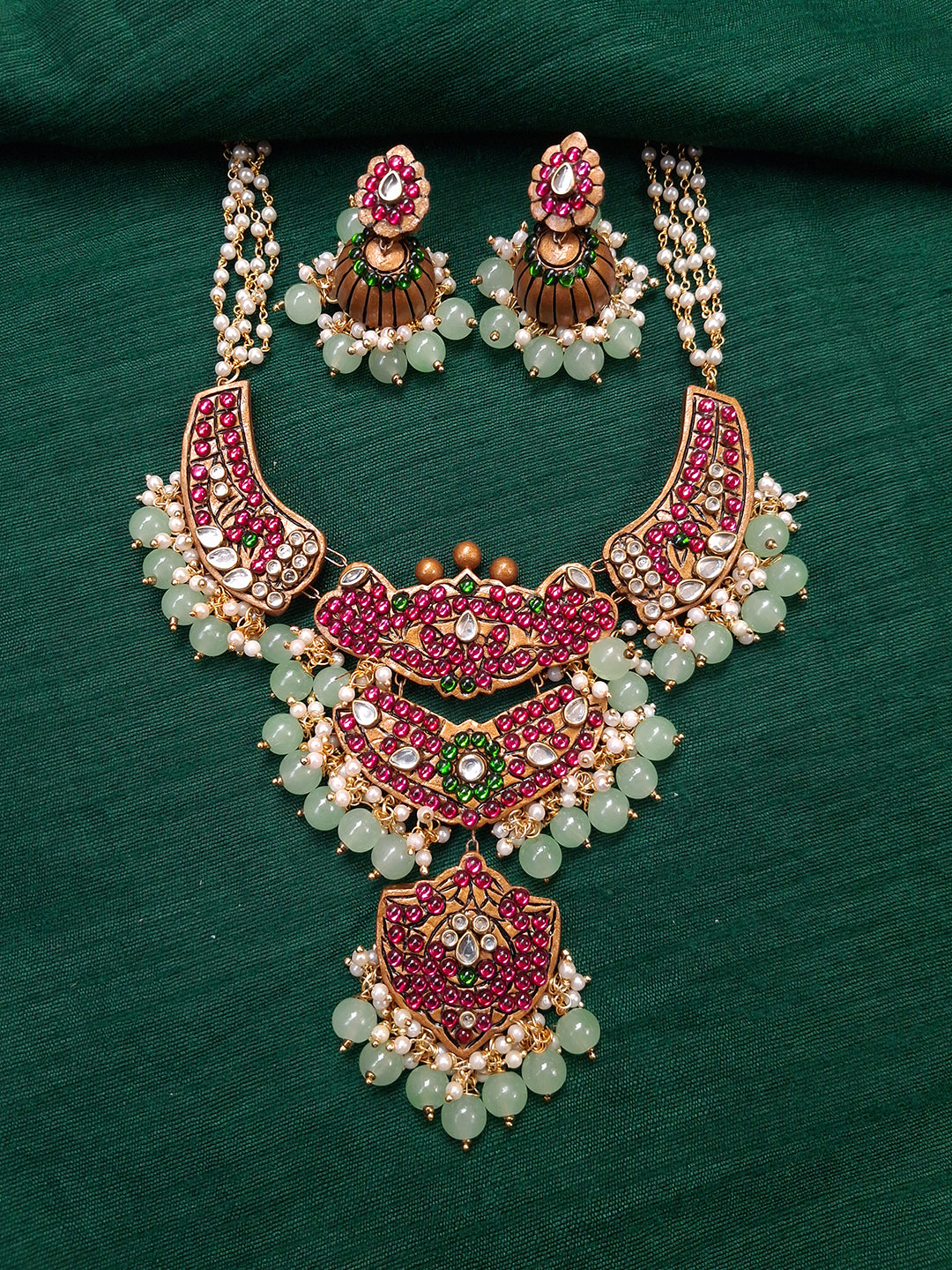 Terracotta Red Kundan-Style Floral Statement Necklace with Green Bead Drops With Jhumkas