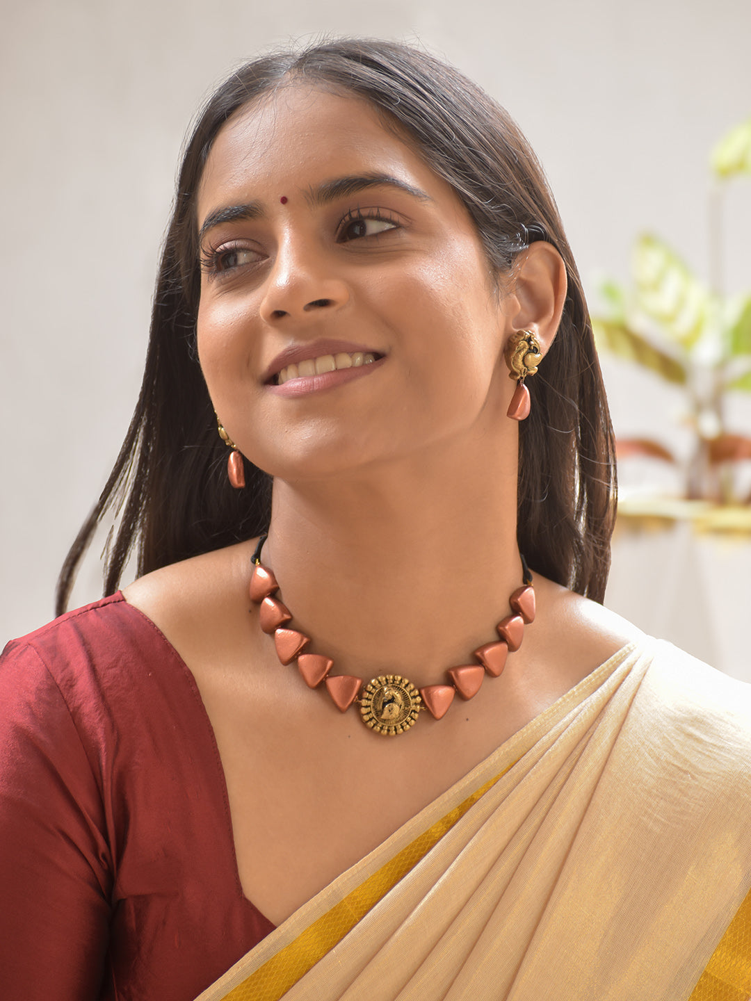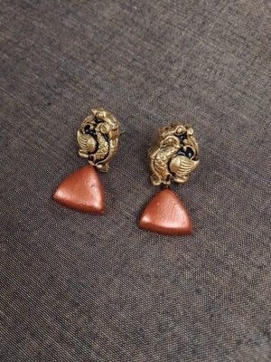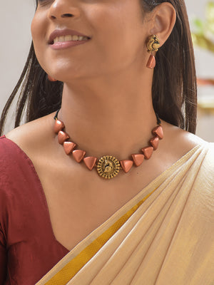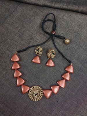 Terracotta Rose Gold Triangle Bead Necklace with Peacock Pendant & Matching Earrings