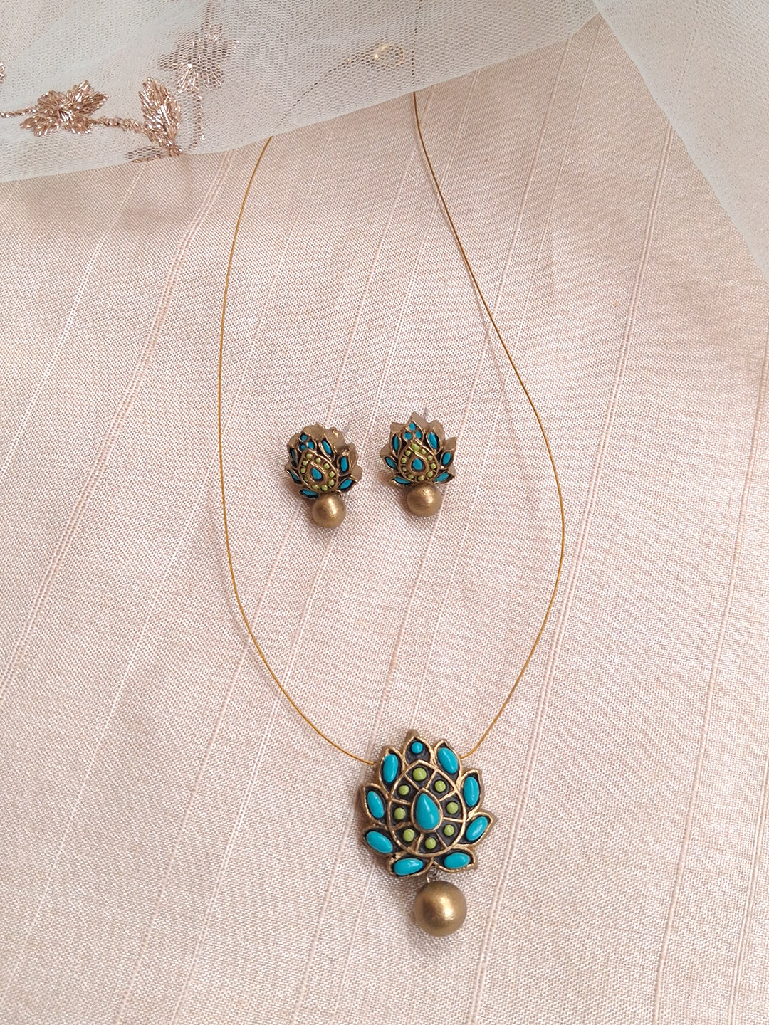 Home Terracotta Teardrop Floral Pendant Necklace with Matching Stud Earrings