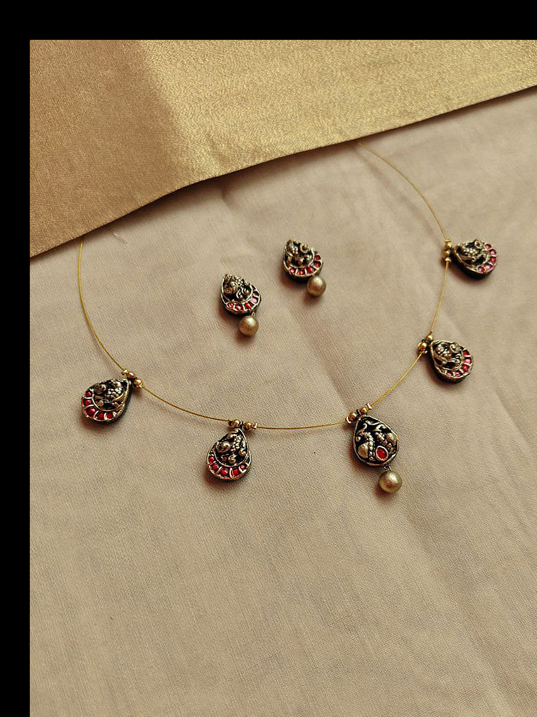 Terracotta Teardrop PeacockPendant Necklace with Matching Earrings – Red & Black