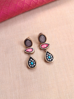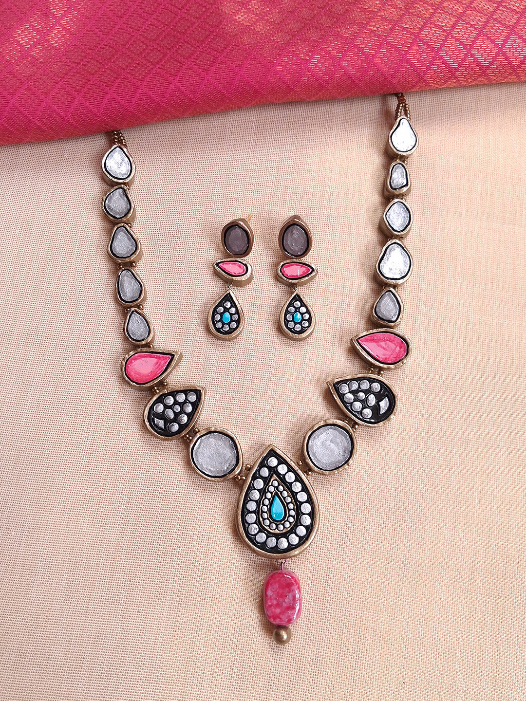 Terracotta Teardrop Pendant Necklace with Multicolor Detailing with Earrings