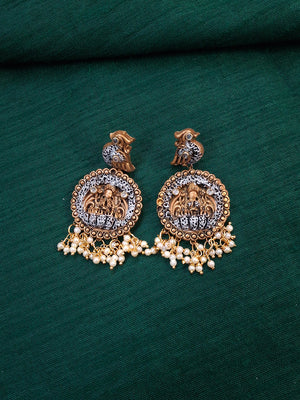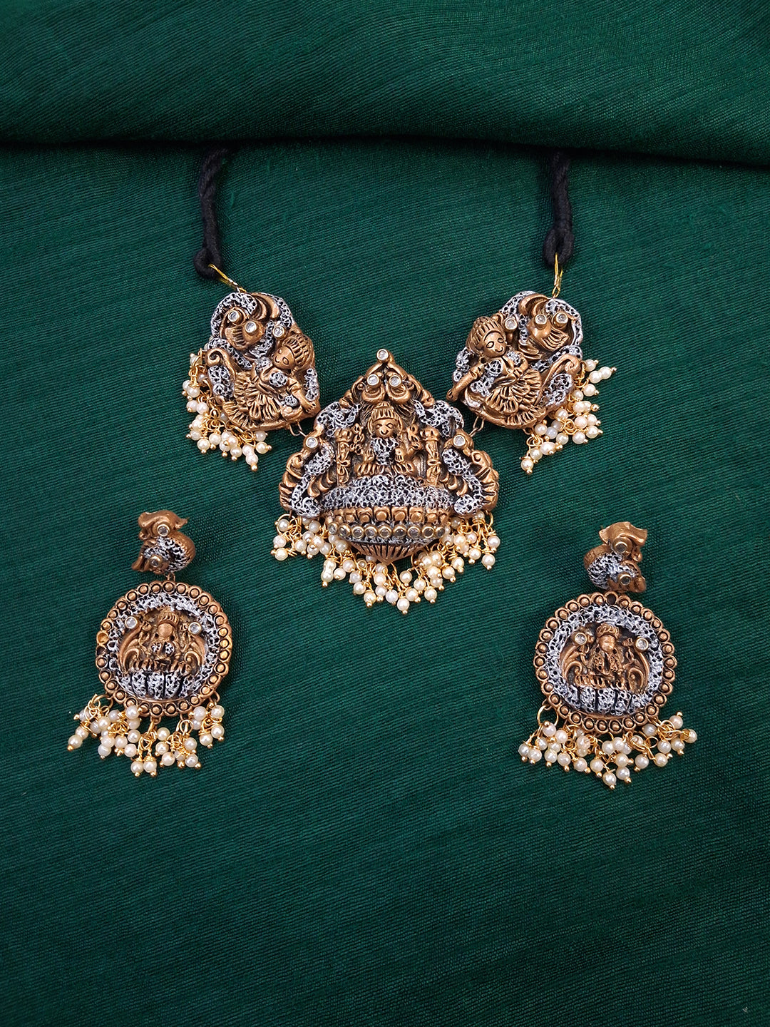 Terracotta Temple Deity Lakshmi Motif Antique Gold Necklace with Pearl Drops With Jhumkas