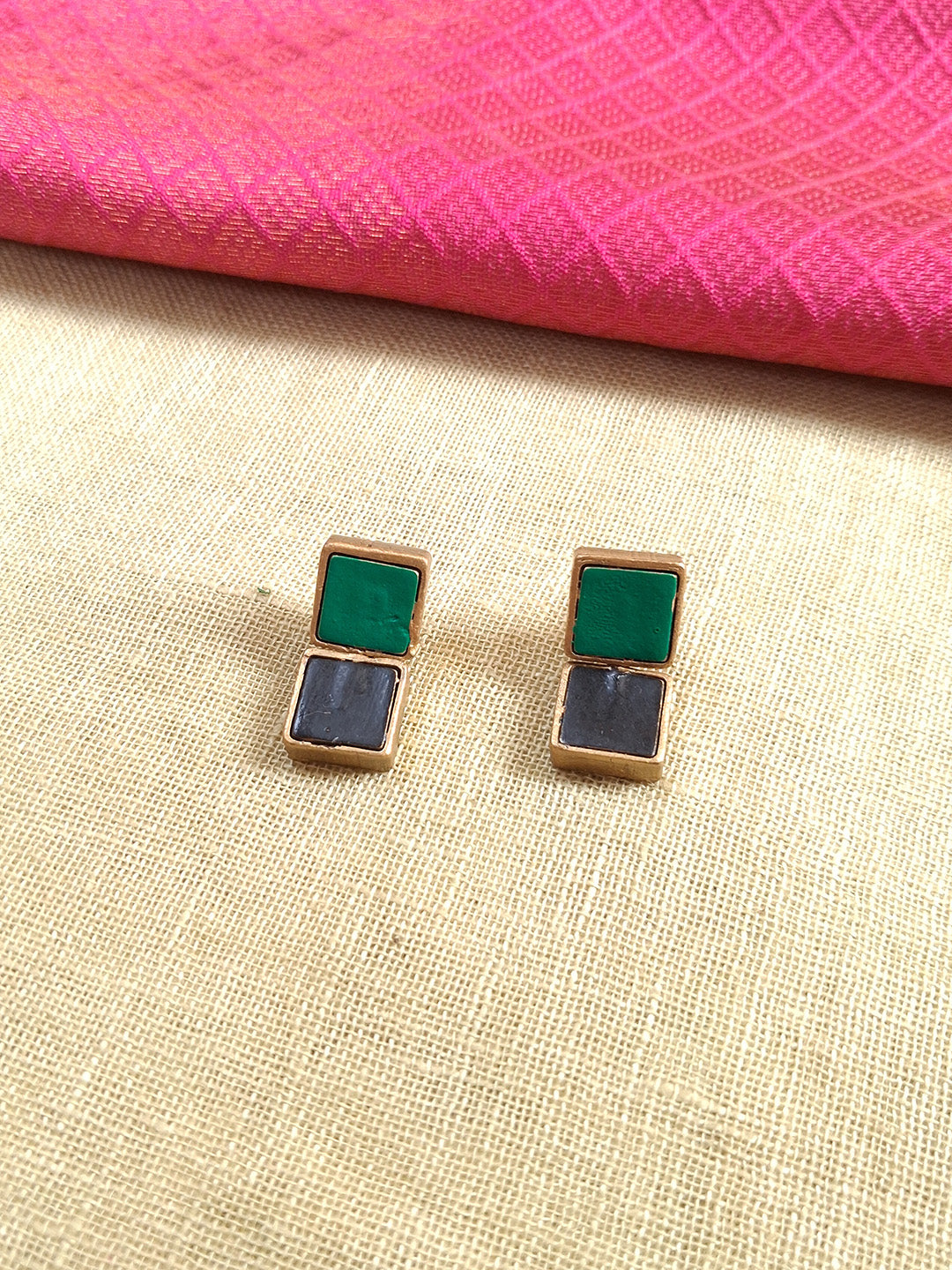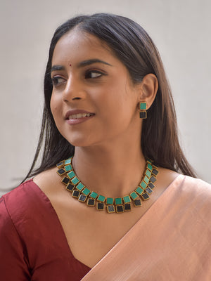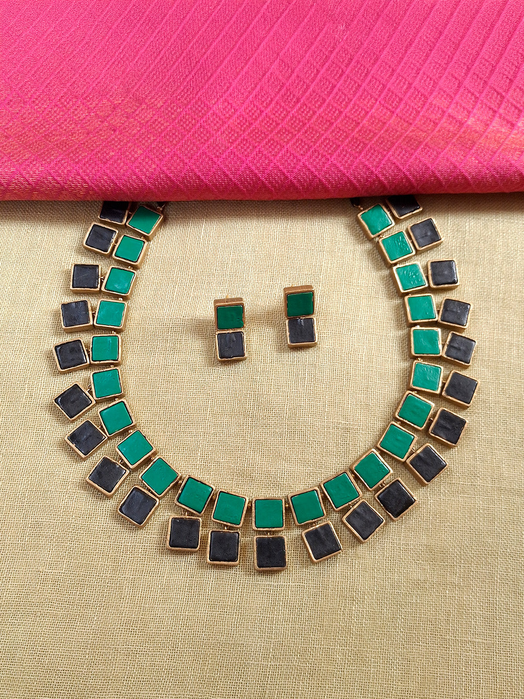 Trilok – Handmade Terracotta Square-Tile Necklace Set in Green–Black Dual Tones with Minimalist Stud Earrings