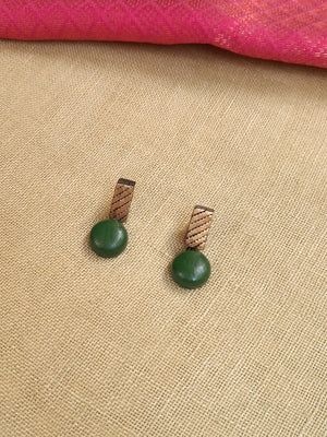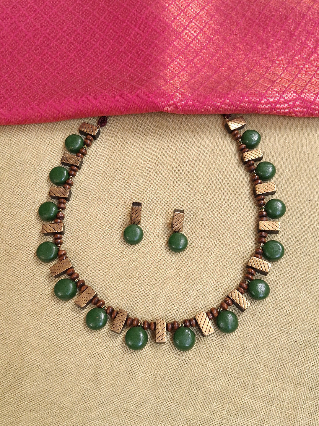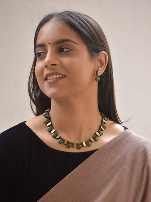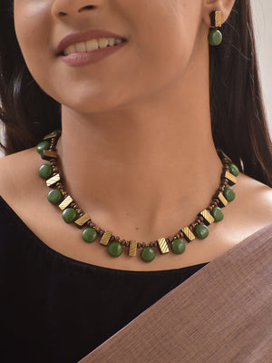 Vamika – Handmade Terracotta Green Bead Necklace Set with Textured Antique Bars and Matching Drop Earrings