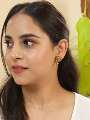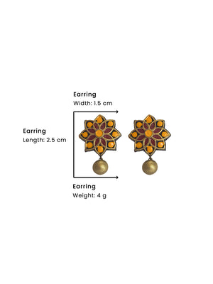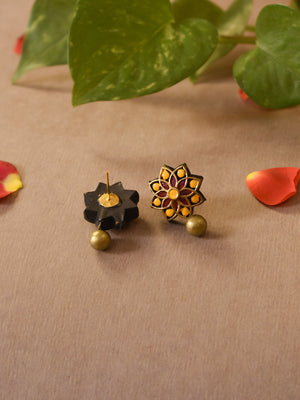 Yellow Maroon Antique Gold Floral Mandala Work Handmade Terracotta Stud Earrings
