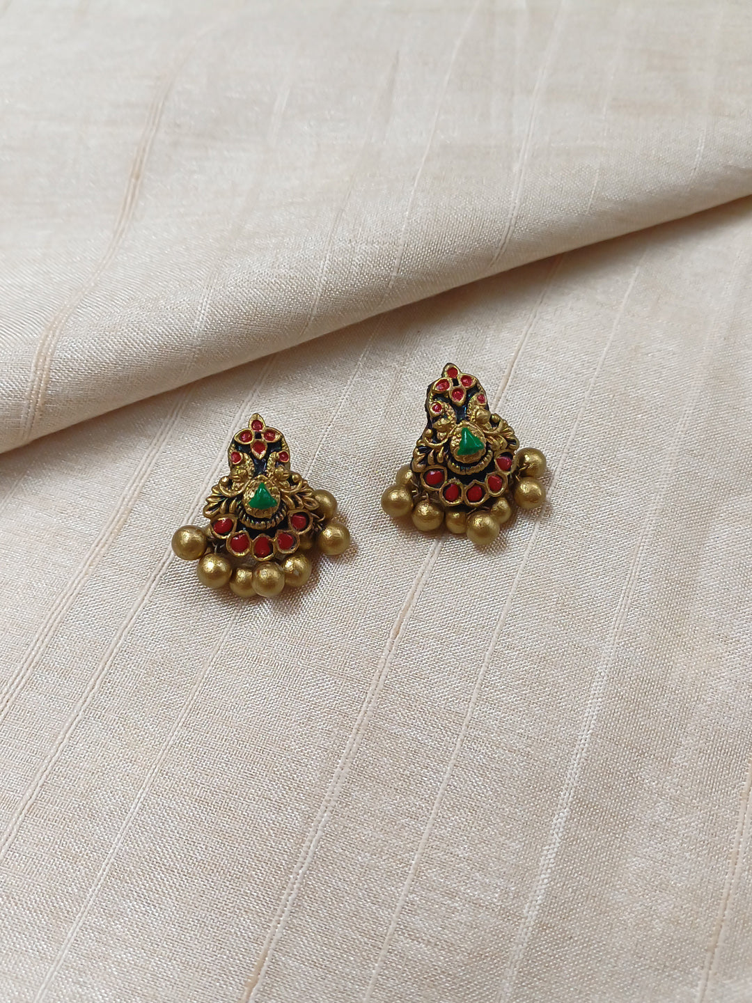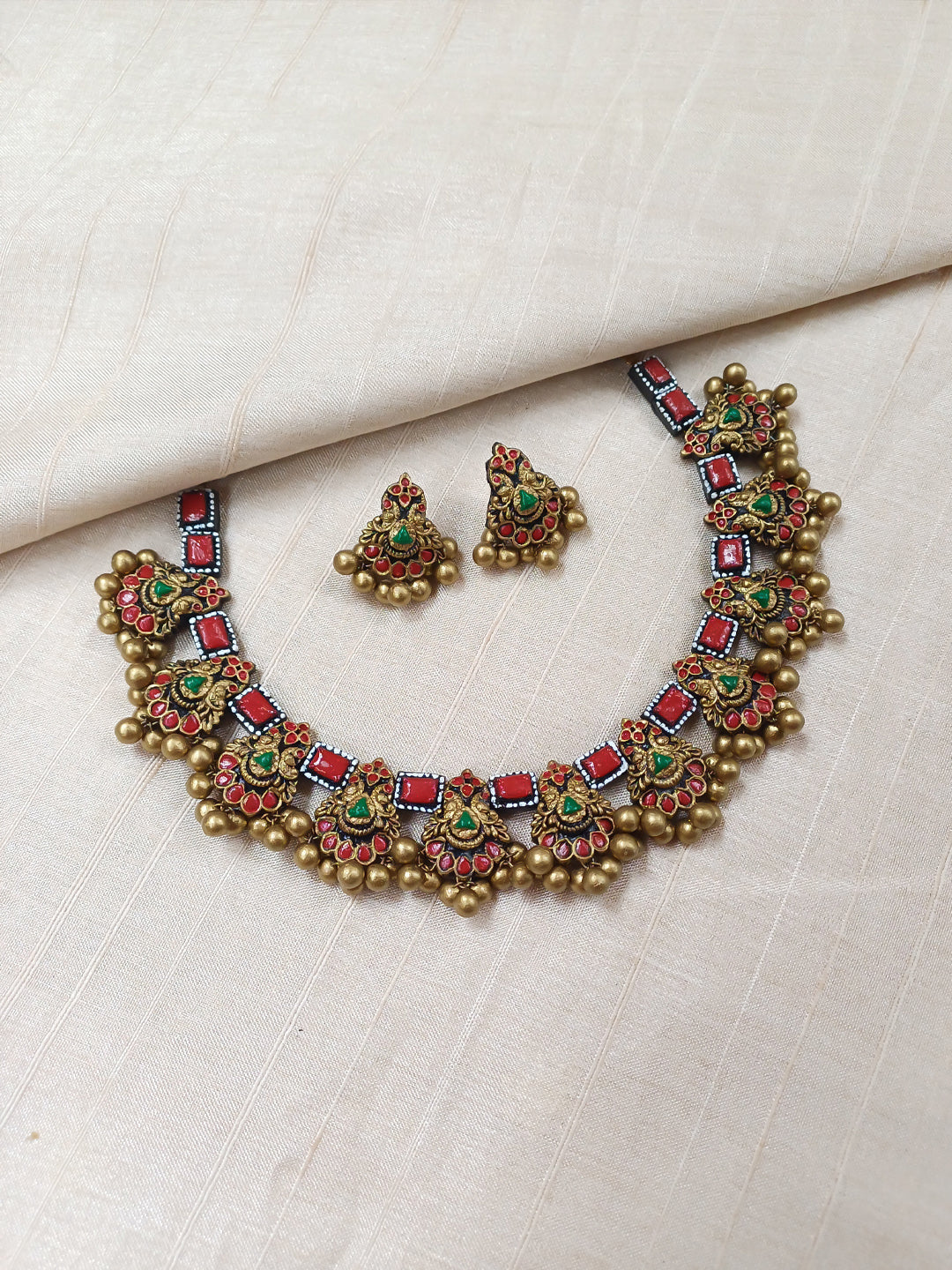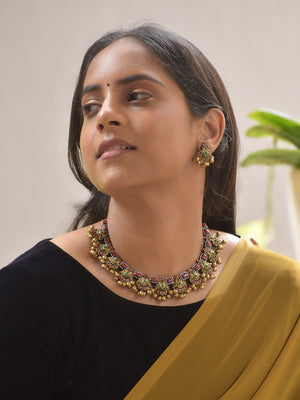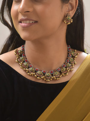 Ranjani - Antique Gold Beads Red & Green Terracotta Temple Necklace Set Stud Earrings