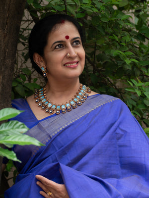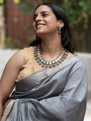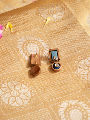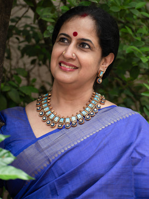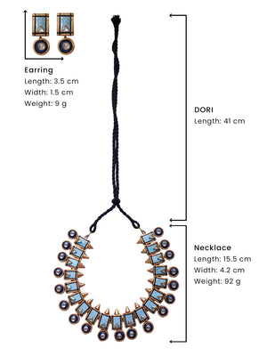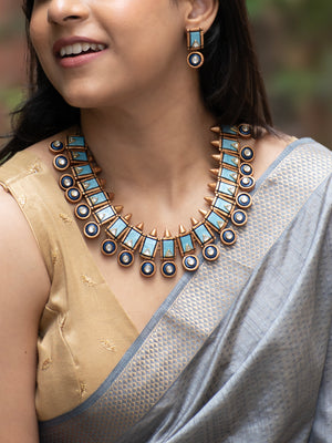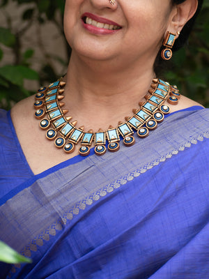 Antique Gold Blue Geometric Design Kundan Fusion Handmade Terracotta Necklace Set