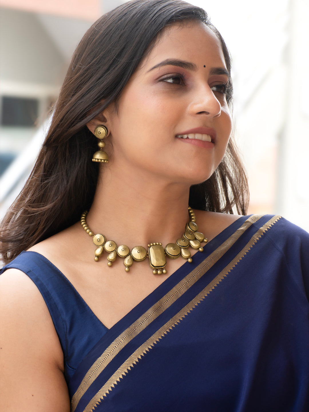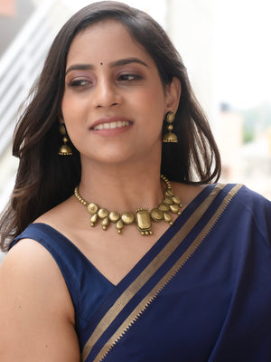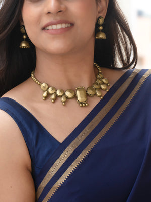 Antique Gold Circular Disc Pattern Pear Dropping Rectangular Handmade Choker Terracotta Necklace Set