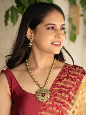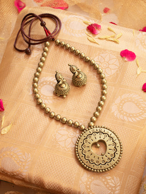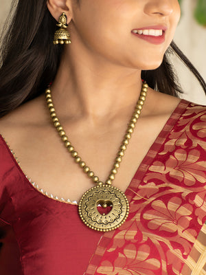 Antique Gold Circular Pendant with Heart Design Handmade Terracotta Mala Necklace Set