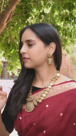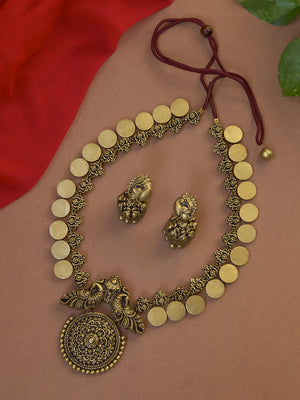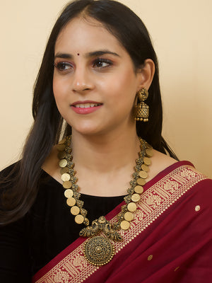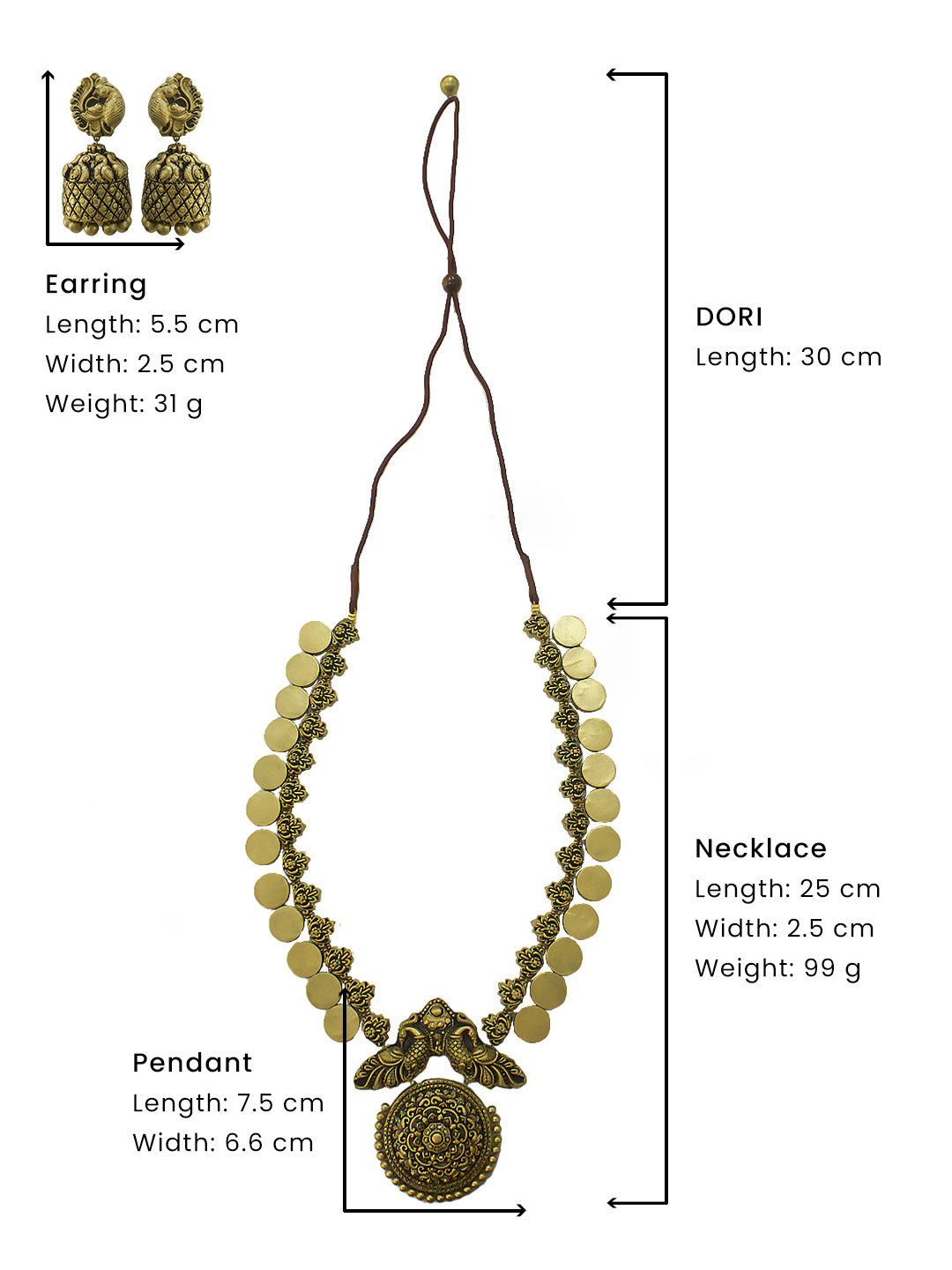 Svarnamayura — Antique Gold Coin Floral Peacock Design Circular Pendant Haram Style Handmade Terracotta Necklace Set