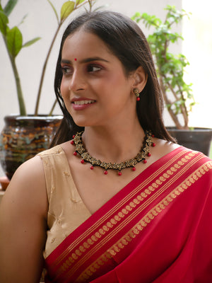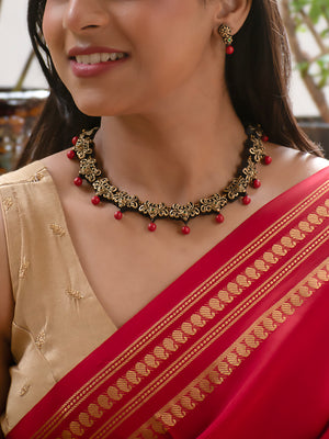 Home Antique Gold Floral Art Work Red Green Kundan Handmade Terracotta Necklace Set